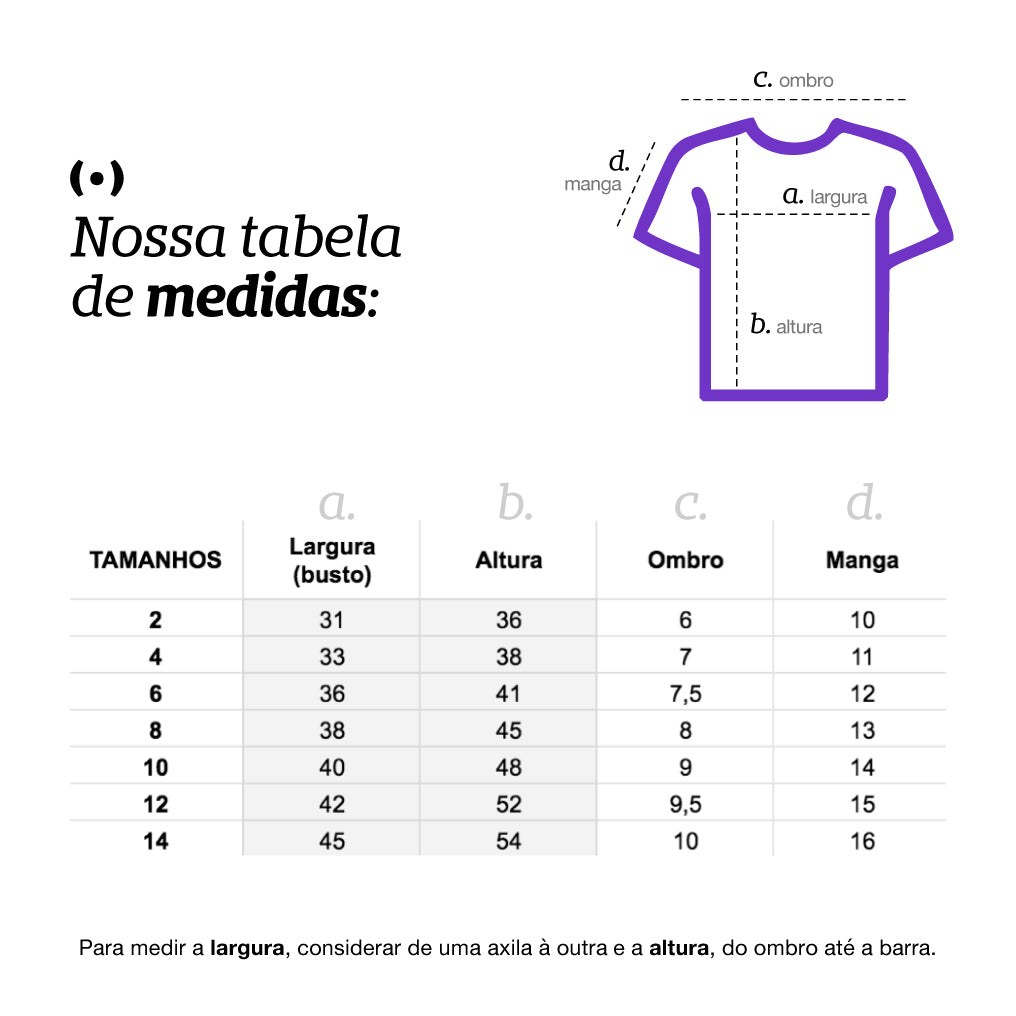 As medidas da tabela são em centímetros e são da camiseta planificada (fora do corpo). Ao medir a circunferência do corpo, divida o valor por 2. As principais delas são: